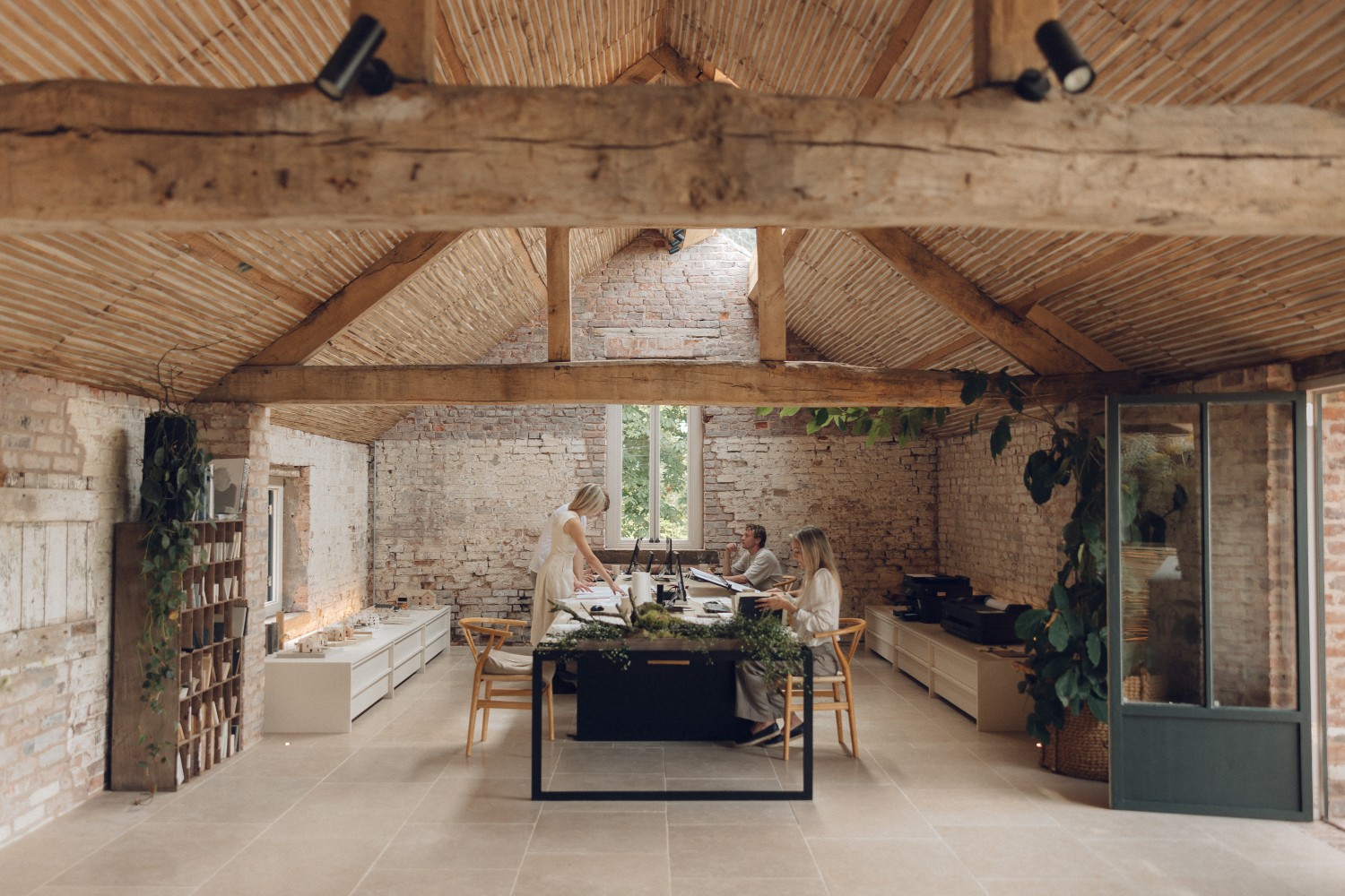 The original Cheshire brick barn, which provides the main working space, has been fitted with farm found materials revitalising the original fabric of the barn and harmoniously connecting the workspace to the rural surroundings. Riven chestnut lath lines the newly insulated roof and stair with an illuminated linen backing creating a glowing transition from the farm into the workspace.